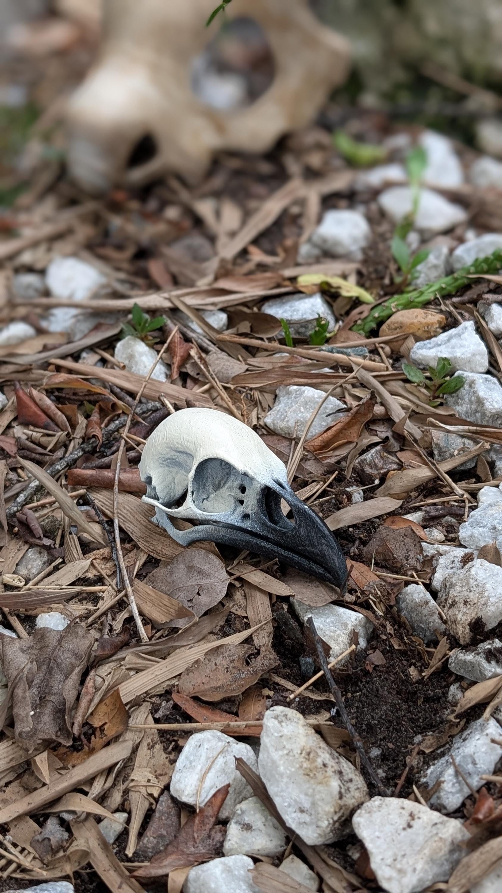 This is a one-to-one scale replica made from a 3D scan of a real raven skull. After hours of precision 3D printing, it was hand-detailed with resin, rubber adhesive, and custom airbrushing to capture the exact look of real bone. The surface even shows a porous, organic texture - making it nearly indistinguishable from an authentic specimen.