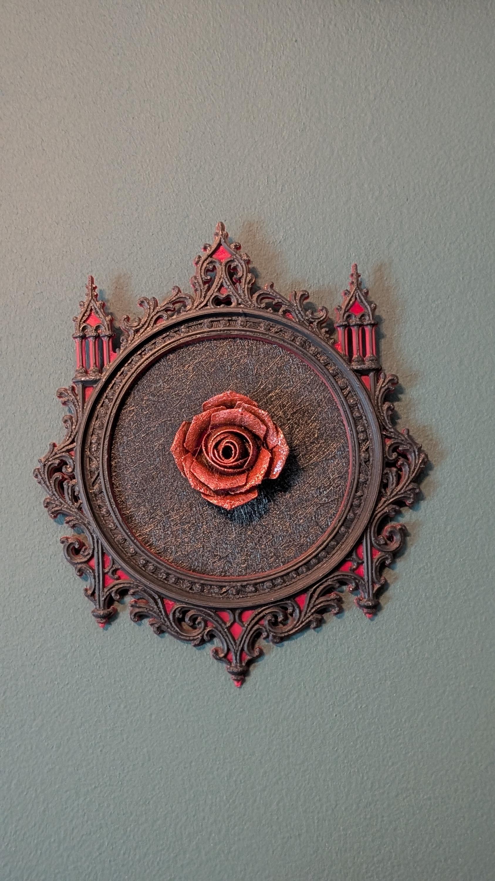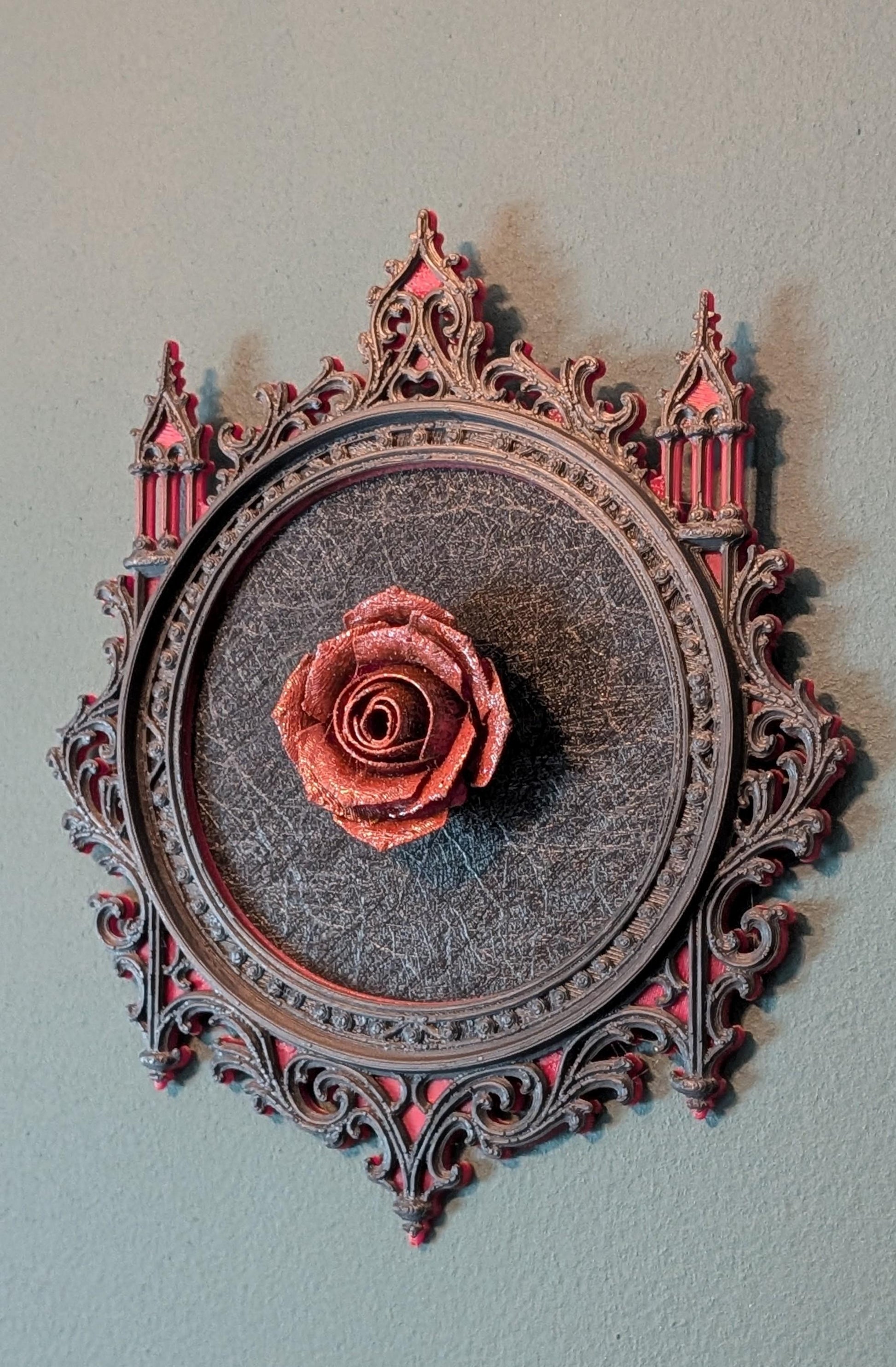These Gothic rose wall pieces combine the elegance of a blooming rose with the ornate drama of Victorian-inspired frames. Each rose is 3D printed with precision, then hand-painted for depth and contrast. The black filigree frame features cathedral-like spires and intricate scrollwork, drawing the eye straight to the rose-whether it's the haunting ivory or the fiery crimson. Perfect for dark romantic décor, witchy walls, or anyone who loves beauty with an edge.
