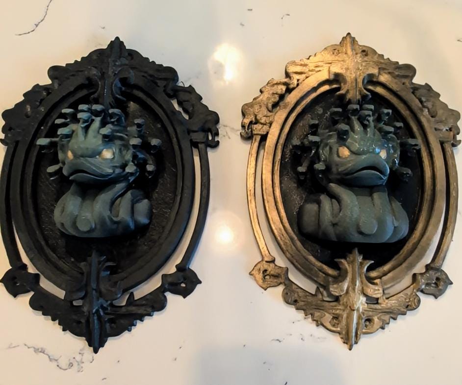 This gothic wall art features a 3D-printed Medusa duck inside an ornate frame, inspired by a real piece from Medusa the Bus-Lux Airbnb in Tampa.