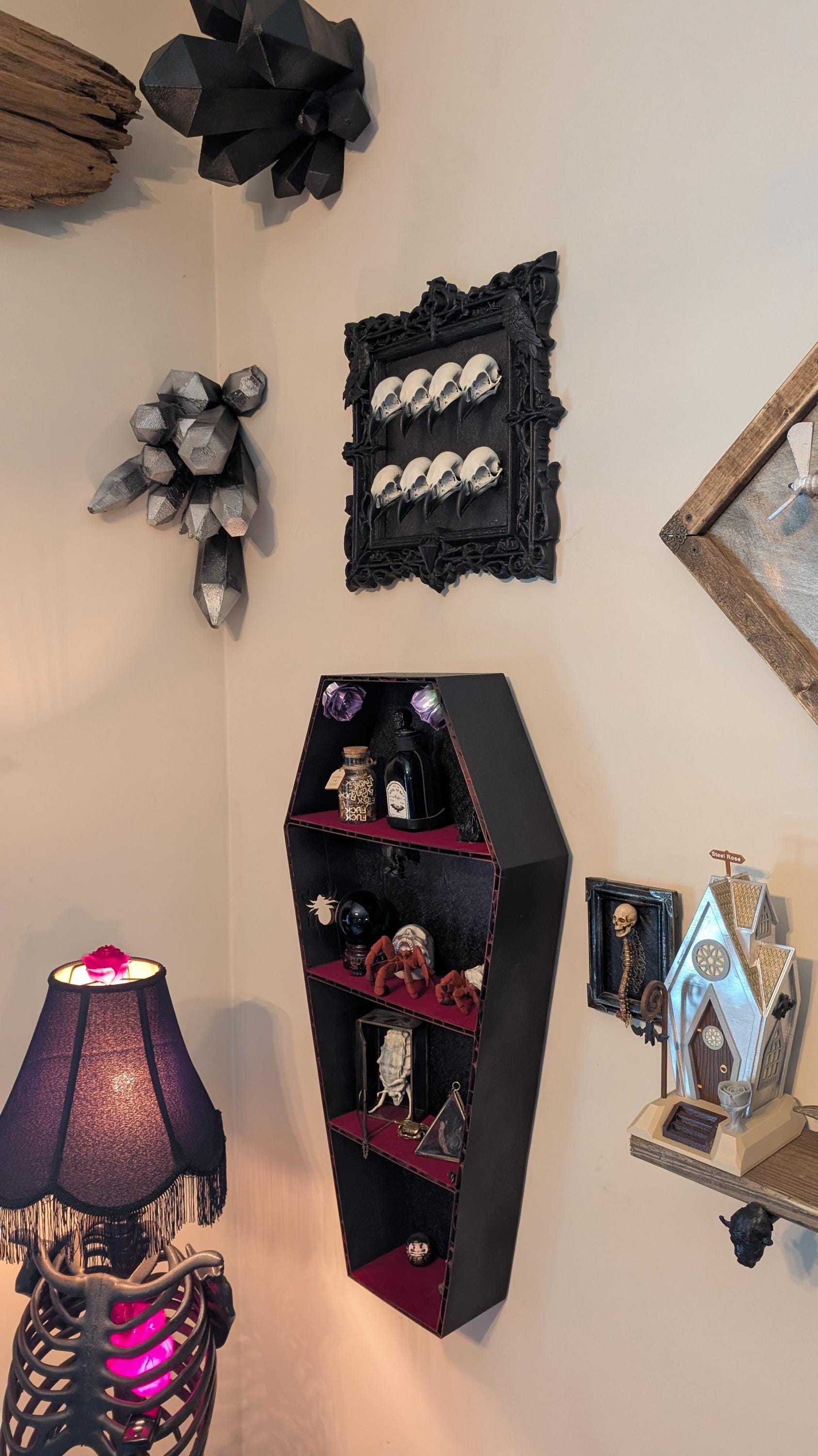 Handcrafted, 3D printed, and painted bone to black like a slow rot, this piece doesn't ask for attention, it demands it. The frame's a gothic fever dream, crawling with detail, barbed like a trap. Every skull's staring down the room like it knows something you don't. Probably does.