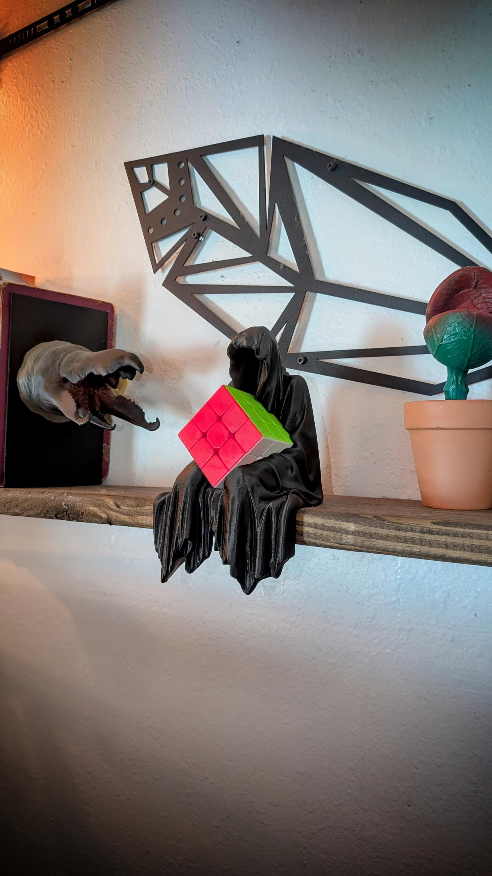 Add a hauntingly elegant touch to your altar, shelf, or vanity with this handmade Phantom Trinket Holder. Cloaked in flowing black robes, this faceless specter grips a clear glass potion bottle wrapped in twine-perfect for holding crystals, rings, or tiny secrets.